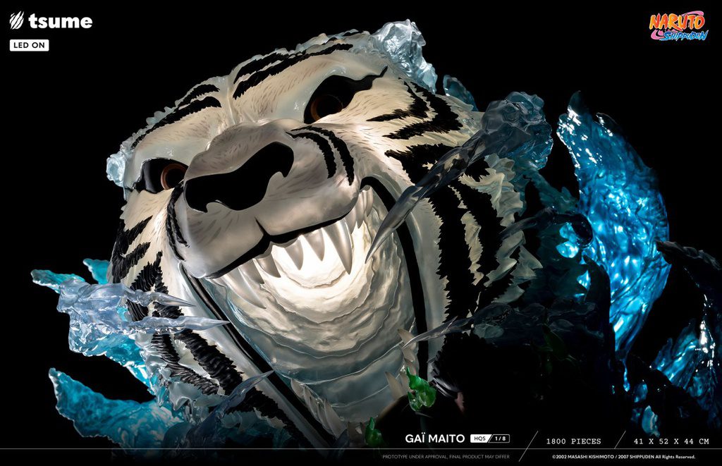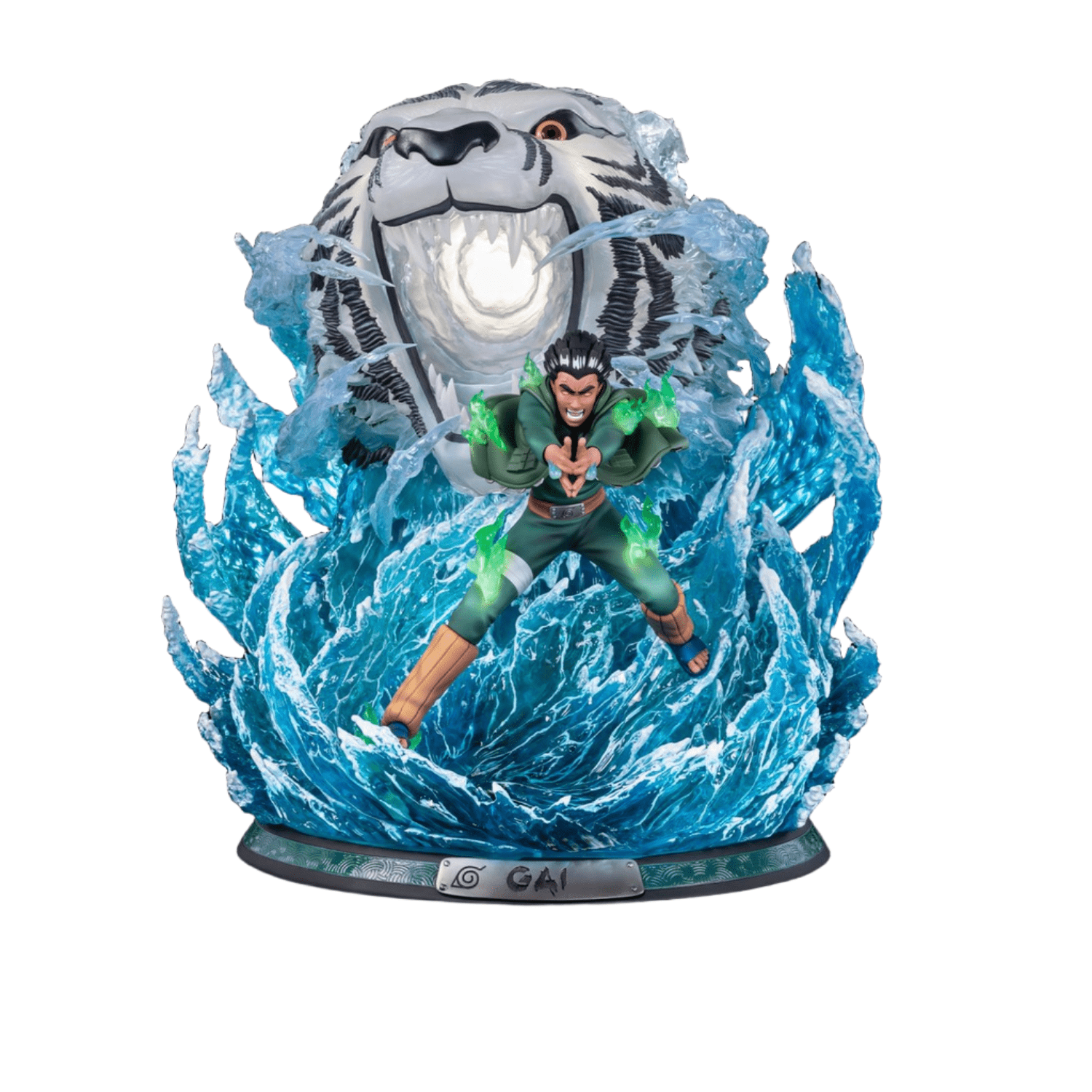 La technique du Tigre du Zénith est représentée par un tigre fantomatique en résine transparente, dont les nuances de blanc et de bleu évoquent la puissance de l’attaque. Les yeux rouges et les flammes de chakra vert vif qui l’entourent ajoutent une profondeur dramatique à l’ensemble. Ce détail remarquable sublime l’art de la sculpture, matérialisant une technique qui symbolise la volonté de Gaï de donner tout ce qu’il a pour défendre ses camarades.