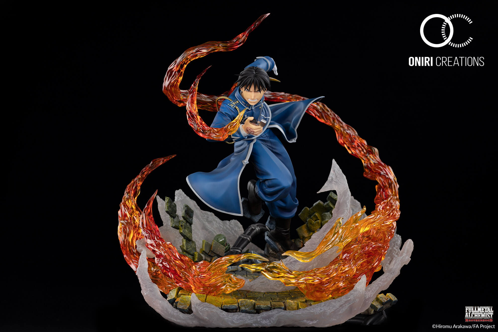 Après Edward Elric, Oniri continue la gamme Fullmetal Alchemist avec le célèbre alchimiste de flammes, Roy Mustang. /nPersonnage central de la série Brotherhood, Roy est un alchimiste d’État puissant doté d’un gant gravé d’un Cercle de transmutation lui permettant de créer du feu d’un simple claquement de doigts. /nNotre statue s’inspire de son combat face à Envy dans lequel Roy laisse parler sa colère et son incroyable pouvoir. /nFace à la déferlante de flammes, l’Homunculus ne peut rien contre le Colonel. /nLimitée à seulement 750 exemplaires, la statue est accompagnée de son certificat d’authenticité.