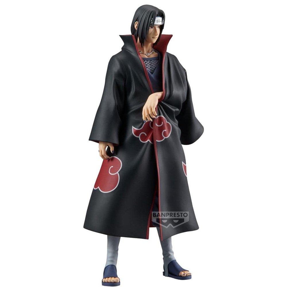 Figurine en PVC d’environ 28cm de haut, représentant Itachi dans une pose emblématique avec son manteau de l’Akatsuki.