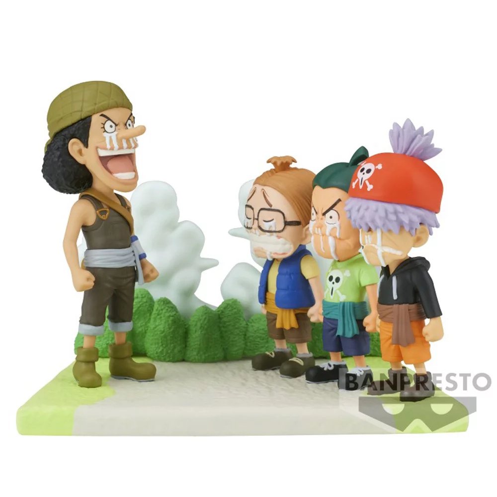 Modèle de 7/cm représentant Usopp faisant ses adieux à ses amis Carotte, Oignon et Piment avant de rejoindre Luffy